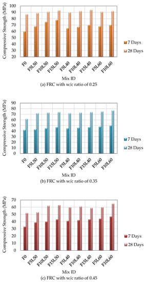 Compressive strengths of FRC with different w/c ratios at 28 days.