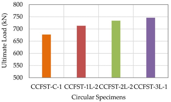 The ultimate loads of the columns were evaluated by Lu et al. []. The ultimate loads of the SFRCFST specimens were affected by both the concrete compressive strength and steel tube thickness in the expected ways: as the concrete compressive strength was increased, the ultimate load was improved; as the steel tube thickness was increased, the ultimate load was enhanced. The ultimate load of the CFST specimens was little affected by the addition of the SFs to concrete. The SFRCFST specimens with 0.6%, 0.9%, and 1.2% SF contents produced gains in the ultimate loads by 2–6%, 4–10%, and 5–14%, respectively, above the benchmark PCFST specimens.