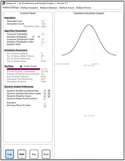 In the use of a single-objective black-box optimization algorithm to select a radius value for fitting the arc, the calculation of the lowest arch height difference is greater than 10 mm, so we continue to use the multi-objective optimization component Wallacei for fit optimization. In the Grasshopper interface, the parameters are set as shown in Figure 8, where Generation Size (iteration size) is 20, Generation Count (number of iterations under each iteration size) is 100, total Population Size (number of iterations) is 2000, crossover probability is 0.9, and the rest are kept at the default settings. The optimization results of the two-span one-break main curved keel are shown in Table 1.