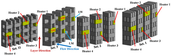 Additionally, as a sample, Figure 2 displays the typical details of setting 2 used in both experimental and CFD simulations. Figure 2b presents the locations of the top planes through the four heating elements of a typical brick model in setting 2. Each heater has a heat generation related to the experimental work range of 8 × 105 to 8.8 × 105 W/m3. The main parameters that classify each setting are represented in Figure 1 and Figure 2.