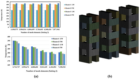 A mesh study has great importance in ensuring precise numerical simulation results. To obtain reliable results around the heating elements, the element size in bricks (quad-structured mesh as shown in Figure 3b) and around them (non-uniformly structured hexahedral) is set to be very small. Independence studies have been performed for the four settings studied. Figure 3 presents two mesh studies from the four settings as an example. The following mesh elements were used for settings 1, 2, 3 and 11: 9,451,554, 7,877,942, 7,158,518 and 9,281,522, respectively [14].