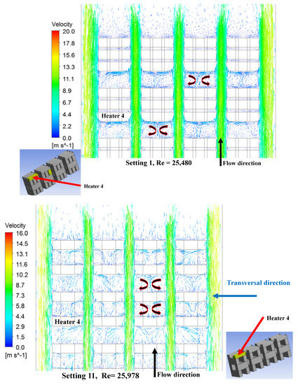 Figure 8 demonstrates velocity vectors between the fifth and sixth rows in a close-up, zoomed view. The plane (Top 4) passes through the transversal heater 4 (H4) for the two settings 1 and 11, at the highest Reynolds number illustrated in Figure 8. The figure shows several vortices between rows for setting 1. There are two counter-rotating vortices for the two middle columns; for columns near-wall, nearly one vortex is formed before the fifth row. This can be attributed to the difference in flow resistance in the middle and near the wall. In addition, a small amount of flow passes between bricks in the transversal direction. This is due to the high resistance to flow in a direction perpendicular to the streamwise direction.