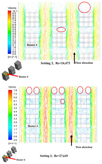 Figure 10 shows a zoom-in 2D cross-section between the fifth and sixth rows for settings 2 and 3 for the velocity vectors plotted for the longitudinal heater 3 (H3). The vortex structure in the two settings is different, where a big wake zone is formed downstream of the longitudinal brick in setting 2. Downstream of the jet, a wake region develops, while upstream of the jet, a sharp velocity gradient, resulting in a temperature gradient. These flow field patterns of the fluid flow significantly influence the heat transfer process between the longitudinal brick in the wall channels and column channels. The low-velocity region in the wake region between the longitudinal brick and the high-velocity region in the jet flow pattern is observed. In setting 3, a good local cooling effect is produced due to the higher velocity in column channels, and a higher convective heat transfer is expected. The map of the velocity vector in setting 2 shows that the wake zone of low velocity is produced behind the columns compared to setting 3.