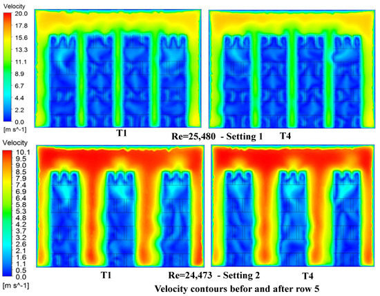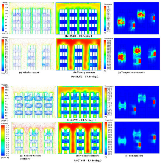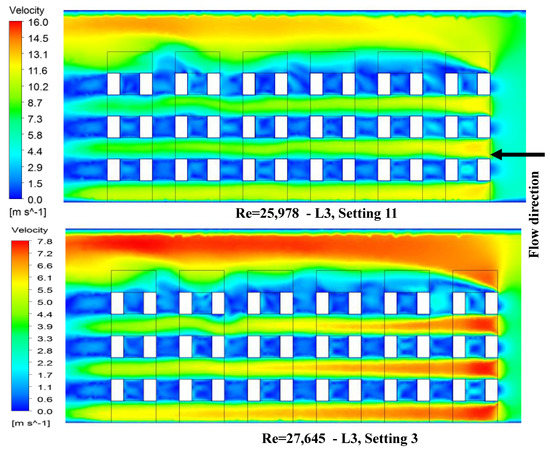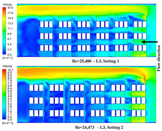 Figure 9 represents the flow field for the second pair of settings (setting 2 and setting 3), which has three columns. The plane (Top 3) passes through the longitudinal heater 3 (H3) at Reynolds numbers 24,473 and 27,645 for settings 2 and 3, respectively. These Reynolds numbers correspond to the maximum inlet mass flow rate (Table 1). The figure shows the velocity vectors, streamlines and velocity contours. Generally, four main jets are formed for the two settings. The two biggest jets are formed in the middle channels between columns. At the same time, the other two jets near the wall are thinner than the middle ones. This can be attributed to the flow resistance, which is smaller in the channel between columns and much higher near the walls. For setting 2, three main separation zones form behind the bricks after the sixth row.