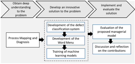 This research project was divided into three phases (Figure 1), following the Design Science Research steps proposed by Kasanen et al. [54]: (i) obtain a deep understanding of the problem; (ii) develop an innovative solution concept for a class of problems; (iii) implement and evaluate the solution. In the first phase, a process map of the customer complaint service was developed to obtain an in-depth understanding of the problems faced by the company in managing customer complaints. In the second phase, the proposed model was devised. A defect classification system was initially developed. Then, the word menu was created for customers to record their complaints. ML algorithms were trained to automatically classify complaint texts and recommend potential problems to be investigated by the warranty service team. Finally, in the third phase of the investigation, the proposed solution was assessed in terms of utility and applicability, and a reflection on the theoretical implications of this investigation was undertaken.