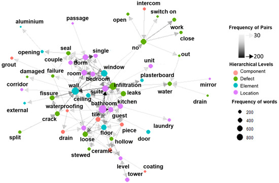 Pairs of words that occur together in the texts were used to create the menu. Figure 2 presents a schematic representation of the frequency of words, how often pairs of words were connected (thickness of the arrow), and citation order (arrow direction). The word “bathroom” is often mentioned before the word “suite”, which is cited together with “wall”. In contrast, “wall” is mentioned before or after “fissure”. Thus, there is no pattern of how customers mention words. For this reason, the word menu was built to establish a logical order of word selection, adopting the hierarchical level of categories as criteria: location, element, component, and defect. Those categories are represented by different colors in Figure 2.