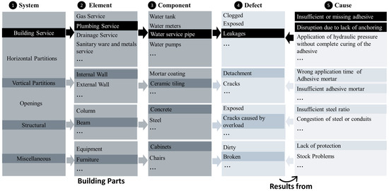 Figure 5 shows the proposed defect classification system with five levels: system, element, component, defect type, and cause. Six categories of systems were identified in Company A: “building service”, “horizontal partitions”, “vertical partitions”, “openings”, “structural”, and “miscellaneous”. The last category refers to elements that do not fit in other categories, such as furniture or equipment.