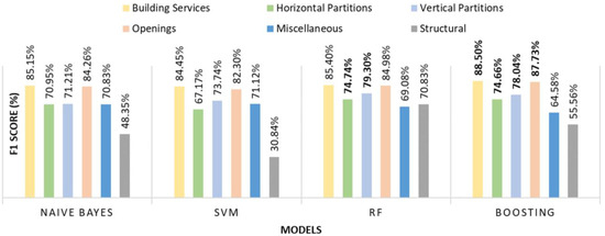 Gradient Boosting again had the best performance for predicting the openings category (F1 Score of 87.73%). However, the other algorithms also showed good performance at around 85%. For miscellaneous systems, the F1 scores for SVM were the highest (71.12%), proving this to be the best model to predict low-frequency categories.