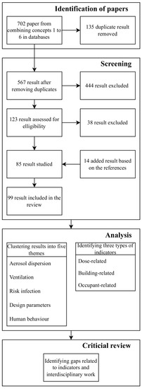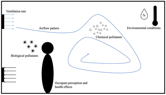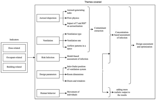 Another issue is that studies often focus on a single indicator, even though different indicators may be correlated with each other [18,19]. Researchers were calling for a more integrated analysis of indoor environments even before the outbreak of the coronavirus. Thus, the aim of this literature review is to present the indicators and approaches used to assess IAQ in the case of airborne transmission through pathogen-laden aerosols across multiple disciplines. In addition, this study attempts to answer the following research questions: