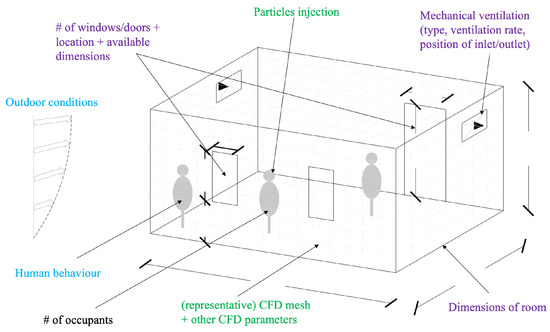 Based on the papers that studied airborne transmission with regard to design parameters, a list of the input data needed to run a simulation, including the design parameters, is provided in Table 4 and is illustrated in Figure 2.