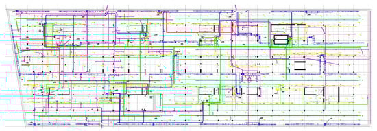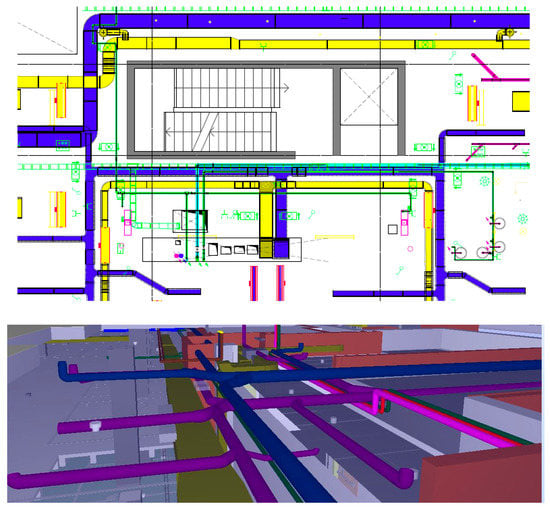 Within a conventional execution project, the networks described above are usually represented as layout designs that define the tracing and operation of the elements and equipment that comprise them. This level of definition is appropriate for projects that do not present excessive difficulty, usually residential projects with a domestic scale of facilities. However, when the building under study, and especially its facilities, present a greater degree of complexity, this system of representation and design can cause uncertainties that lead to the appearance of incidents: interferences or crossings between facilities; lack of foresight of spaces for the passage of facilities; or, in general, a lack of coordination between disciplines that are not foreseen in the project phase and that are transferred to the construction phase, which means an increase in costs and delays []. This is why MEP installations must be designed in coordination with each other, to avoid conflicts of location of equipment and networks, common when the design of these elements is carried out in isolation [].