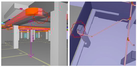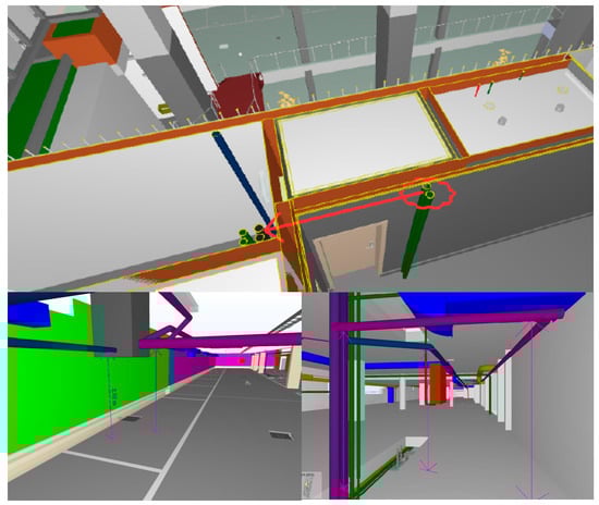 Once the incidents have been resolved, the BIM model is considered closed and the necessary documentation for the correct execution of the construction phase can be obtained from it (H8)—in this case, measurements and planimetry from the Final Execution Project (PED). It is important to note that this new planimetry collects the information provided by the model, incorporating it with the original two-dimensional information at the altimetric level of each element of the MEP facilities, as Figure 10 shows. In this sense, the BIM model should become a working material used in the development process of the construction [], serving as a virtual prototype for consultation and support to search for the three-dimensional visualization of the agreed solutions [], as Figure 11 shows.