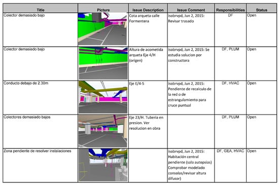 Therefore, despite the fact that the results achieved after the process of coordination of MEP facilities through virtual BIM models is satisfactory, allowing one to solve important incidents, bring forward deadlines, and reduce costs in the execution phase of the work, the promoters, both public and private, can detect a failure in the automation of the detection, which causes delays in the design process and hinders the implementation of this type of technology in real development projects.