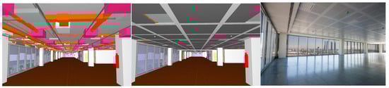 Representation of the BIM coordinated model of facilities (left), with architectural elements (center), and the final image of the built real space (right).