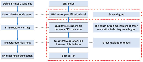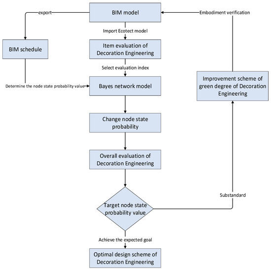 As the following Figure 4, the green degree evaluation process of interior decoration is divided into two stages: sub-item evaluation and overall evaluation. The former is the basis, and the latter is the purpose. First, all information of the BIM model, BIM schedule, and Ecotect secondary analysis are used to evaluate the green evaluation indicators of the interior decoration project based on BIM. Then the final green degree of the interior decoration is evaluated by the BN model. For the green goal to be achieved, the reasoning function of the BN model is used to improve the design scheme through evaluation feedback and then obtain the optimal design scheme to ensure the realization of green interior decoration and reduce decoration energy consumption.