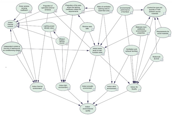 The process of constructing a Bayesian network structure normally requires a lot of data for network structure training. However, it is difficult to obtain relatively complete green evaluation data of building interior decoration. Moreover, it is easy to lead to deviation when using incomplete data for research. On the basis of national standards and the relevant literature, the causal relationships between nodes were identified as the preliminary version. The final causal relationships between nodes were determined after conducting expert interviews with 20 design institutes. After that, the Bayesian network model of interior environmental quality assessment of building interior decoration is established, as shown in Figure 5.