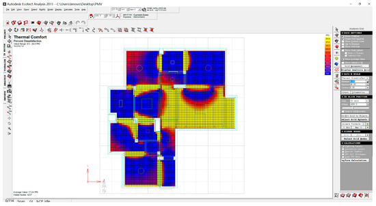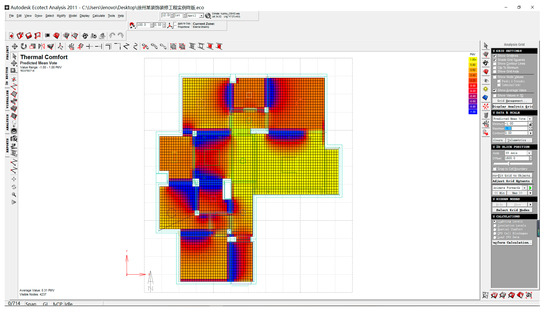 An interior decoration project in Xuzhou, China, was used as a case study. It is a sub-work of residential real estate. The case is one typical apartment on the 6th floor of this project. It is three bedrooms and two living rooms, which are shown in Figure 6. The Ecotect analysis software was selected to simulate and calculate indoor thermal comfort. As shown in Figure 7, it can be seen that the average value of PMV in the chosen building is 0.31. In the ISO 7730-2005 thermal comfort criteria, the recommended value for the PMV indicator is −0.5 to +0.5, while PPD is < 10% [54]. Combined with Chinese conditions and relevant studies, the generally acceptable range of thermal comfort is PMV: −1.0 < PMV < 1.0; the corresponding PPD < 26%. Therefore, for an ordinary room without heating and air conditioning, PMV = 0.3 represents a comfortable environment. in Figure 8, it can be seen that the average value of PPD is 17.24, which is also within a reasonable range [54,55]. In conclusion, the indoor thermal comfort index of the building meets the standard. Thus, the indoor thermal comfort value state1 is set to 100%.