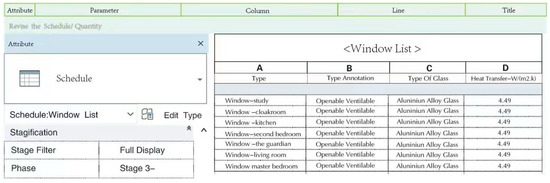 The results can also be verified through the window list generated by Revit software (Figure 9): all windows of the case project are made of aluminum alloy glass, and the heat transfer coefficient is more than 2.0 W/(m2⸱k). Therefore, it is determined that the external window heat transfer coefficient does not meet the standard requirements. Hence, the value is set to 100%.