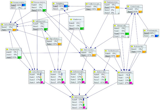 Based on the current status, the node status of each secondary evaluation index is upgraded by one level. For example, the node value of “Heat transfer coefficient” is changed from “state0 = 100%” to “state1 = 100%”. It means the designer requires to change the new window glass material, which has lower thermal conduction properties. According to this conception, the Bayesian network model is updated, and the evaluation results are shown in Figure 11. The indoor thermal environment state 3 value increased from 64% to 79%; the indoor light environment state 3 value increased from 69% to 78%; the indoor acoustic environment state 3 value increased from 59% to 68%; the indoor wind environment state 3 value increased from 82% to 85%; the indoor air quality environment state 3 value increased from 67% to 81%; the value of state 3 of target node indoor environment quality increased from 55% to 78%. The state 3, was 41.82% higher than the previous design scheme. The data demonstrates that the above optimization scheme is feasible for the indoor environmental quality of building interior decoration.
