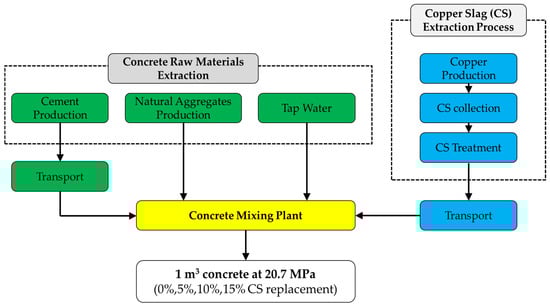 As shown in Figure 1, considering an LCA adopting a cradle-to-gate perspective, the system commences with raw material extraction and lasts until concrete production. As one of the raw materials of concrete, cement is transported to the concrete mixing plant. Natural aggregates are assumed to be located close to the concrete mixing plant, and thus their transportation is considered negligible. The processes belonging to the construction phase and onwards are excluded in this study, because this study is focused on concrete that uses CS as a material, and because of the huge variance in the application of concrete in construction. CS is assumed to be a by-product, conforming to the criteria set by Directive 2008/98/EC [32]. Consequently, this assumption required the inclusion of environmental data related to the process of copper production, up until the recycling process of the CS for commercial purposes. The CS extraction process commences from copper production, wherein the CS is collected and treated, before being transported to the concrete mixing plant. The mixing plant then creates an output of 1 cubic meter of concrete with or without CS as a partial cement replacement using the raw materials of concrete and the copper slag delivered.