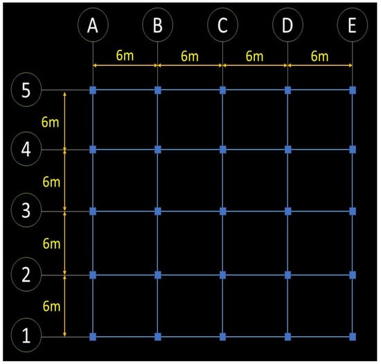 The three-story and seven-story structures were designed based on a typical floor plan from the previous literature, as shown in Figure 2 [37], with a typical 3.0-meter story height, and were designed with various concrete strengths: 20.7 MPa, 27.5 MPa, 34.5 MPa, and 41.5 MPa. The design strengths employed were selected because they are the typical concrete design strengths used in Philippine construction settings, and are concretes that are achievable without the use of admixtures. The yield strengths of the reinforcements used were 415 MPa for longitudinal reinforcements and 275 MPa for shear reinforcements, as this is the usual practice in the Philippines.