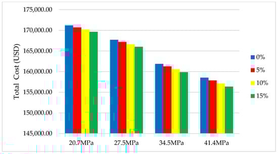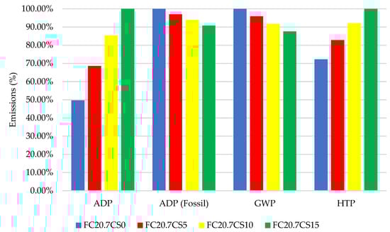 Figure 3 presents the results, obtained using Simapro, regarding the impact of using 20.7 MPa concrete with varying amounts of CS as partial cement replacement on the following environmental categories: ADP, ADP (Fossil), GWP, and HTP. It was observed that the use of CS in concrete alleviated risk in the environmental categories ADP (Fossil) and GWP. The environmental impact on GWP was reduced by a maximum of 12.41% when a 15% mass substitution of CS was used. Furthermore, this category was observed to possess the greatest reduction in emissions, due to the lower amount of cement used, which is a material acknowledged for being a major contributor to emissinos that cause global warming.