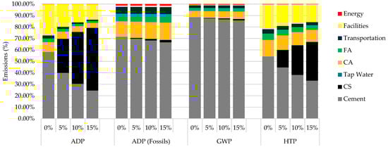 CML-IA Baseline V3.06/World 2000, developed by the Center of Environmental Science of Leiden University in the Netherlands, was the LCA method selected to perform the impact assessment for the following categories: Abiotic Depletion Potential (ADP), Abiotic Depletion Potential of Fossil Fuels (ADP (Fossil)), Global Warming Potential (GWP), and Human Toxicity Potential (HTP). The reason for limiting the impact assessment of this study to the aforementioned categories was that the study focuses on the influence of using CS as a concrete SCM on the depletion and extraction of mineral and non-renewable resources (fossil fuels), which are denoted by ADP and ADP (Fossil), respectively [35]; its effects on the contribution of greenhouse gas emissions to global warming, as reflected in the GWP category [35]; and its effects on emissions that are toxic to human health, as depicted by the HTP category [36]. Impact assessments are expressed through percentage emissions of concrete systems with varying percentages of cement replaced with CS, while concrete containing 0% CS is set as the reference concrete system in the comparative analysis.
