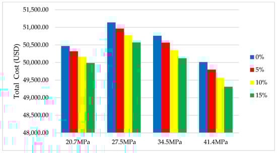 The ETABS design results were further processed into slab, beam, and column schedules that were used as the basis of the cost estimates of concrete, reinforcements, and formworks of all building models. With reference to Figure 5 and Figure 6, it can be observed that the use of concrete CS as an SCM lowers the total cost of the structures, both three-story and seven-story, regardless of the design strength of the concrete. For both structures, when using concrete with a design strength of 20.7 MPa, the maximum replacement percentage of 15% of CS reduced the cost by a maximum of about 0.90%. As for the three-story and seven-story structures using concrete with a design were of 27.5 MPa with a CS substitution of 15%, the reductions in total building cost was only 1.0% and 1.10%, respectively. When the concrete strength was 34.5 MPa, for both structures, the maximum cost reduction was achieved with a CS substitution of 15%. Lastly, using concrete with a design strength of 41.4 MPa for both structures, the maximum cost reduction was also obtained at 15% CS, corresponding to a reduction of 1.40%. In the further interpretation of these results, the greater the replacement percentage of CS, the lower the total building costs incurred, both in the case of the low-rise and the mid-rise buildings, due to CS being lower in cost than cement.