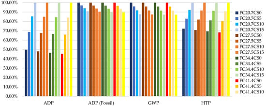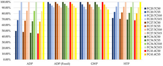 As for the category of ADP (Fossil), there was also a reduction in impact observed with increased substitution of cement with CS, reaching a maximum of 9.22% with 15% replacement of cement with CS. Conversely, the use of concrete with CS as an SCM resulted in increases in ADP and HTP. In the ADP category, this impact reached its maximum—an increase of 50.32%—when 15% CS was used in concrete, while for the HTP, the maximum impact corresponded to a 27.75% increase when using the same amount of CS. The increasing effect in these categories could be attributed to the additional quantity of CS, which tends to be detrimental to such an extent that it outweighs the advantageous effects of using smaller amounts of cement.