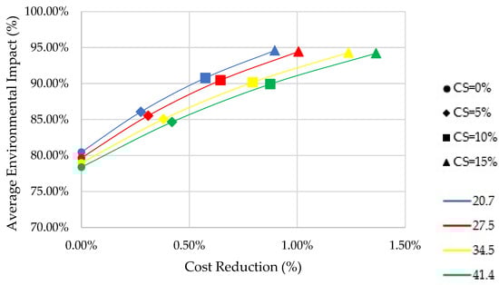 In order to be able to assess the risks compared to the advantages of using CS in reinforced concrete buildings, the environmental emissions were plotted against the cost reduction brought about by using concrete with CS as partial cement replacement, reflecting the environmental impact or increased emissions against the cost reductions as presented in Figure 9 and Figure 10. Examining Figure 9, a cost reduction of 0.96% in a three-story building will yield a 14.92% increase in emissions when using FC20.7CS15. With the highest cost savings of 1.40%, the environmental emissions or impact increase the most, by 15.83%, with the FC41.4CS15 concrete system. From Figure 10, it can be seen that, for a seven-story building utilizing FC20.7FC15, a cost reduction of 0.90% corresponds to a 14.12% increase in emissions, while a cost savings of 1.36% yields a 15.83% increase in environmental emissions when using the FC41.4CS15 concrete system. Nonetheless, even though there is an established relationship between cost savings and environmental impact, the cost savings obtained by using CS as SCM in reinforced concrete are minor in comparison to the increase in environmental emissions.