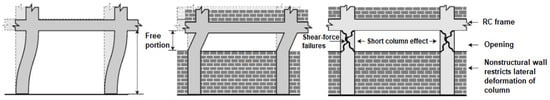 Columns as vertical load-bearing elements may involve some negative parameters that would weaken the defence mechanism of the building. One of these parameters is short columns that may form in time. Short columns have formed in different ways. Short columns may occur either because the original column length-to-depth ratio is small or due to an obstacle along a certain height of the column (e.g., low brick masonry wall), in which case the effective length of the column is reduced. The sudden and explosive nature of shear failure in a short column was first pointed out by Yamada and Furui in 1968 [36]. Although considerable experimental and theoretical research has been conducted on this subject, especially in the 1970s and ’80s, neither a generally accepted way of predicting the behaviour of short columns exists nor special provisions concerning the design of such elements are included in the majority of codes [37].