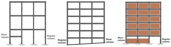 Having both long and short columns in the same storey of the building causes these columns to be subjected to different shear forces during the earthquake due to the height difference. Earthquake loads primarily affect long and flexible columns and then affect short columns, where they cause energy accumulation. Due to this accumulation, X-shaped shear cracks occur at both the lower and upper ends of the column. Long and short columns with the same cross-sectional area suffer the same displacement (Δ) under earthquake load (Figure 1). However, short columns are more rigid than long ones, so they are subjected to more earthquake load. This is referred to as the short-column effect and is a point that needs to be considered in the early phases of architectural design [41]. Short column formations in the buildings are given in Figure 2.