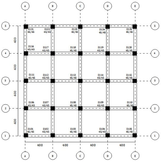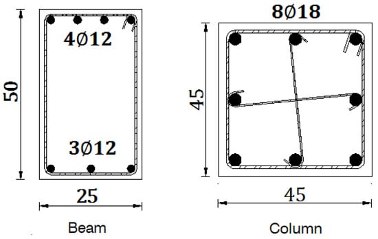 The cross-section and dimensions of the beams and columns used in the reinforced concrete structure chosen as an example are shown in Figure 6. All columns and beams have the same size and reinforcement in the sample RC building model. In the calculations, the effect of slabs on the stiffness of the beams is neglected, and slabs are considered only as loads. As can be seen in Figure 6, a reinforcement selection was made in the columns according to the minimum longitudinal reinforcement ratio (0.01) allowed for the columns of TBEC-2018. In addition, by using crossties with stirrups, the maximum spacing requirement between stirrup arms has been reduced below 25 × Øtransverse. In beam supports, the tension reinforcement is above the minimum reinforcement ratio (0.8 fctd/fyd) and below the maximum reinforcement ratio (ρb, ρmax etc.) given in TS-500-2000 and TBEC-2018. In addition, the compressive reinforcement/tensile reinforcement ratio of the beams in the supports was kept above 0.5and the ductility condition of the beam support section specified for SDS > 0.75 in TBDY-2018 was also met.