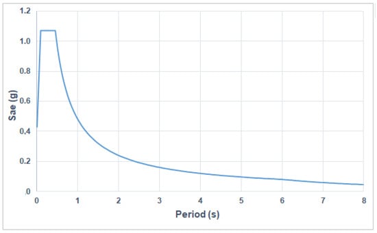 In this study, since two different design approaches in the current seismic design in Türkiye are taken into account, the design spectrum used in this country has been taken into account. For this purpose, the design spectrum obtained for any geographical location in Burdur province was used. Along with the earthquake hazard map currently used in Türkiye, map spectral acceleration coefficients (SS, S1) have been used for the first time. By multiplying these coefficients with the local soil effect coefficients (Fs, F1), the design spectral acceleration coefficients are obtained separately for a short period (0.2 s) (SDS) and a long period (1.0 s) (SD1). These values are directly obtained with the help of the Türkiye Earthquake Hazard Maps Interactive Web Application [65], which has been implemented with the current earthquake code. This study used this application was used for the location where the building will be built. The design spectrum used in structural analysis is shown in Figure 5.