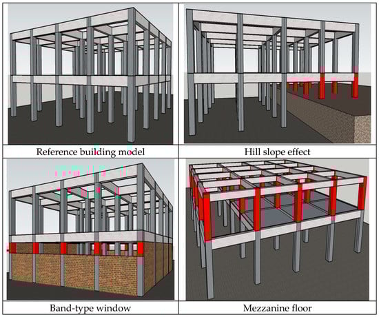 The reference building model and short column formation models considered in the study are shown in Figure 7. Red-coloured columns are modelled as short columns. Only the appearance of the first 2 storeys is shown for a better understanding of the structural models.