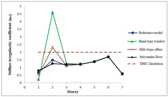 - According to TBEC-2018, the stiffness irregularity coefficient (nki) can be more than 2, especially in buildings with band-type windows. This indicates that the irregularity referred to as B2 may be critical for these buildings. A similar situation exists in models with a hill-slope effect, albeit limited. In the case of this irregularity, some limitations have been introduced for the application of the Equivalent Seismic Load Method;