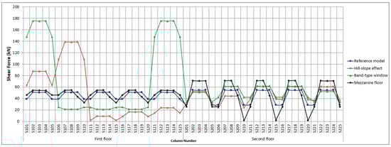 In order to examine the effect of short column formation on the column shear force, the shear forces of the columns in the first and second storeys were obtained for four earthquake types (Ex+, Ex−, Ey+, Ey−), and these values are shown in Figure 10. When the shear force of the columns on the first storey is examined, the models with the highest increase in shear force compared to the reference model are the band-type window and the hill-slope effect models, respectively. Shear forces in the first storey columns of the mezzanine floor and reference models were close. When the column shear forces on the second storey are examined, the model with the highest shear force increase is the mezzanine floor model. The shear forces on the second-storey columns of the band-type window and the hill-slope effect models were close to the reference model.