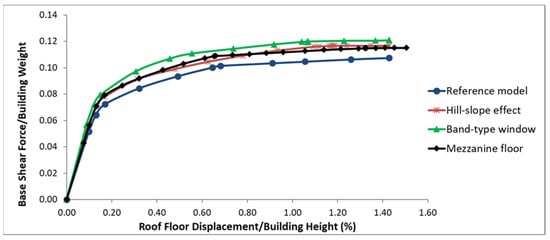 In order to examine the effect of short column formation on section damages, a non-linear behaviour model of each of the reference models, the hill-slope effect, the band-type window and the mezzanine floor models were created. Plastic rotation limits were obtained for the Damage Limitation (DL), the Controlled Damage (CD) and Prevention of Collapse (PC) performance levels conditions given for the lumped plastic hinge model of columns and beams modelled as bar elements in TBEC-2018. After the plastic hinge sections of each structural element were determined, these hinges were assigned to both ends of the column and beam elements. M3 plastic hinge is used for beams, and P-M2-M3 plastic hinge is used for column sections. Moment-curvature analyses obtained plastic hinge properties of the sections. In these analyses, the unwrapped Mander stress-strain diagram was used for the shell concrete and the wrapped concrete for the core concrete. In the moment-curvature analyses, the yield unit strain of reinforcement steel is 0.0021, the tensile strain of reinforcement steel is 0.1, the yield strength of reinforcement steel is 420 MPa and the tensile strength is 550 MPa. A P-joint definition for shear power consumption has not been made, as necessary precautions have been taken regarding shearing in the elements. Second-order effects are neglected in the structural analyses. Horizontal loads were applied to the story mass centers of the model buildings according to the values obtained by multiplying the mode shape amplitude of the X-direction of the floors, and the masses and static pushover analyses were performed. The capacity curves obtained for the X direction are given in Figure 11.
