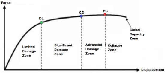 Two essential performance-based design and assessment parameters are earthquake demand and capacity [55,56]. Static pushover and capacity curve serve as representations of structural capacity. This capacity curve is created by plotting the relationship between the base shear force and the displacement of the building’s roof. The building system is calculated with gravity loads and lateral forces that increase proportionately up to the target point where structural capacity ends. The non-linear static method’s actual goal is to calculate a building’s target displacement, which is then used to do a final pushover analysis by increasing lateral loads until the target displacement is reached. In conclusion, demand values such as strains, displacements, internal forces and rotations are calculated, and the behaviour of the analysed section is measured for different cross-section performance levels by comparing the strains obtained from the total curvature of the section with the determined upper bound strains [57,58,59].
