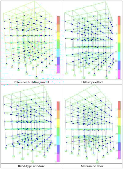 Considering the common situations that cause short column formation, a total of four different structural models, including the reference model where no short column formation is expected and three different models where potential short column effects may occur due to the hill slope effect, band-type window and mezzanine floor, were created using SAP2000 software [66]. In the structural models, the blueprint of the sample RC building has not been changed; the short column lengths and their axes are given in Table 2. All other columns not included in this table are considered non-short columns. While creating the structural models, separate short columns were created for the three cases that caused the formation of short columns and were considered in the study. Structural features were kept constant in order to reveal the short-column effect.