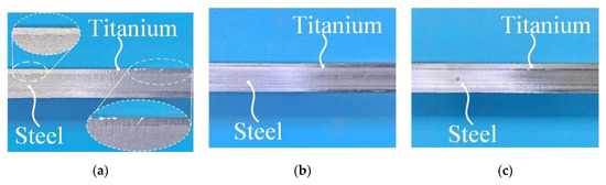 The investigated specimens were sampled from two hot-rolled bonding TC bimetallic steel plates (with 40 MPa and 200 MPa interface shear strength grades, respectively) and an explosion-bonded TC bimetallic steel plate. A total of three plates were all manufactured by bonding TA2 titanium alloy (GB/T 3621-2007 [18]) and Q355B steel plates (GB/T 50017-2017 [19]), which are 2mm and 8mm thick, respectively. It is worth noting that the cladding metal and substrate metal in the three types of TC bimetallic steel with the same grade are not from the same batch. Given the fact that these three materials with different interface conditions were not prepared at one time, the size of the specimens in different groups was adjusted during the preparation. All the specimens’ size conforms to the corresponding design standards, and the difference does not affect the comparison of the experimental results. The test data that were used in this paper were all extracted from the previous studies under similar test conditions, which has been reported in detail previously [12,16]. Figure 2 shows the interfacial conditions in different types of the TC bimetallic steels. The interface of the explosion-bonded specimen presents an irregular wave texture with the cladding and the substrate metals blending with each other, which probably results in more potential defects in the bonding interface, as shown in Figure 2a. While the interface of the hot-rolled bonding specimen, whether the bonding grade is low or high, is relatively flat, and almost no macroscopic defects can be observed at the bonding interface, as shown in Figure 2b,c. The characteristics of the bonding interface depend on the manufacturing methods. Explosion bonding is carried out through a progressive impulse resulting from a short duration release of high energy from an explosion [3,4]. Plastic deformation is caused by non-uniform pressure at the bonding interface, resulting in the cladding metal and the base metal blending. In the hot-rolled bonding process, the metallic bond is formed by the achievement of diffusion between the substrate and cladding metals [3], which has more a stable quality due to the adequacy of the hot-rolling process [20], resulting in a flat bonding interface. To distinguish the three types of materials that were investigated herein, the designation of test specimens includes the manufacturing methods and interface bonding conditions. For example, specimen HCF-HR-LBS-1 represents a high-cycle fatigue (HCF) test specimen that was manufactured by the hot-rolling (HR) process with low bonding strength (LBS). The last number in the designation denotes the serial number in the group.