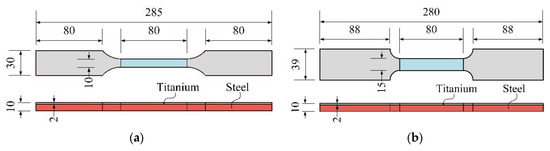 The shear strength is one of the most important parameters for evaluating the quality of the bonding interface [23]. It was tested through bonding interface shear tests in accordance with the Chinese standard GB/T 6396-2008 [23]. The standard shear test specimens were used, as illustrated in Figure 4, and loaded with a rate of 0.5 N/s. An auxiliary device was used to carry out the shear tests [16], with the cladding metal placed on a platform and the base metal suspended. The testing machine pressed the base metal to make the cladding metal fall off the specimen. The peak load that was generated in the test process was considered as the specimen’s interfacial shear capacity. The bonding interface shear strength was obtained through dividing the peak load by the shear interface’s area of the specimen. A total of three or four repeated specimens (ST-HR-HBS-1~4, ST-HR-LBS-1~4, and ST-EB-HBS-1~3) were tested for each type of material.