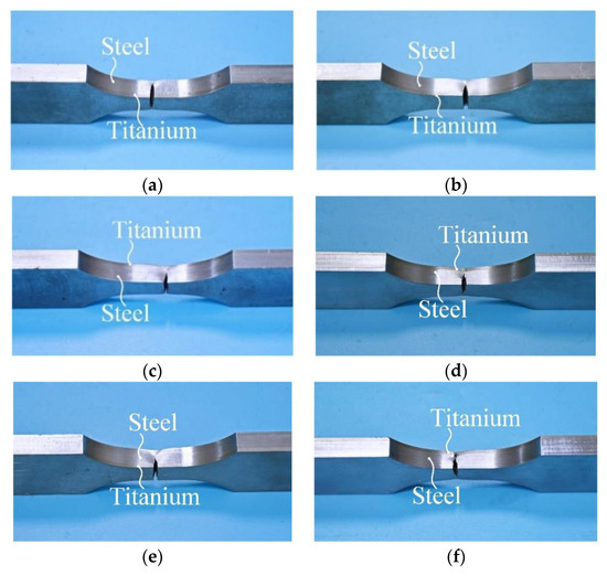 Figure 8 shows typical fracture photos of the three types of fatigue specimens, which can be classified into three failure modes. In the first one, the fatigue crack initiation occurs at the interface. Since the cladding metal is much thinner than the substrate one, crack propagation preferentially penetrates the cladding metal despite the titanium alloy possessing better fatigue resistance, as shown in Figure 8a,b,e. In the second one, the fatigue crack initiation occurs at the surface of the substrate steel due to the better fatigue resistance of the cladding titanium alloy, as shown in Figure 8c,d. The third one is the combination of the above two, and a penetrating crack is formed in the middle of the substrate metal, as shown in Figure 8f. Table 3 shows the number of specimens corresponding to each failure mode, including the number of undamaged specimens. The explosion-bonded TC bimetallic steel mainly failed in the way of the first failure mode, with a fracture of the entire cladding metal and a majority of the substrate metal, as shown in Figure 8a. The explosion bonding-process may result in more potential imperfections at the bonding interface [25], which is why explosion-bonded TC bimetallic steel failed in the way of the first failure mode. There were two failure modes that were found in the specimens of hot-rolled bonding TC bimetallic steel with low interfacial shear strength, as shown in Figure 8b,c. The hot-rolling process maintains the high quality of the bonding interface, resulting in more crack initiation occurring at the surface of the substrate steel. However, low interfacial shear strength still makes the interface a potential imperfection for crack propagation, resulting in more than a quarter of the specimens failing in the way of the first failure mode. For hot-rolled bonding TC bimetallic steel with high bonding strength, despite the first two failure modes, as shown in Figure 8d,e, one more failure mode with two fatigue crack initiations was found in this kind of specimen, as shown in Figure 8f. The following section will illustrate the fatigue S-N curves of these three types of materials, of which the hot-rolled bonding specimens with high bonding strength are subjected to larger stress levels during the high-cycle fatigue tests due to its better fatigue property than the other two materials’. Therefore, two crack initiations are more likely to propagate simultaneously. The apparent separation was observed at the bonding interface only in the hot-rolled specimens with low bonding strength. Due to the test equipment self-protection system, the specimens were not entirely fractured after the fatigue test. In conclusion, the manufacturing methods and the bonding interface strength greatly affect the high-cycle fatigue phenomena of TC bimetallic steel. In addition, previous research [13] has shown that if the specimens maintained the original roughness (i.e., hot-rolled surfaces), the second failure mode with fatigue cracks initiating at the surface of the substrate steel would occur in most cases. This proves that the bonding interface and the surface roughness are two significant factors affecting the high-cycle fatigue properties of the TC bimetallic steel.