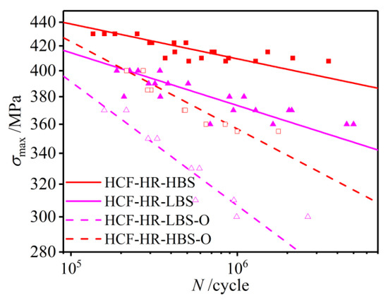 Figure 10 shows the comparison of the fatigue S-N curves of the hot-rolled bonding specimens with that of the corresponding original plates, in which the symbol “O” means the specimens are processed from the original plates without surface polish. Previous studies [13,16] have reported the fatigue behavior of the original plates, which is also higher than the fatigue design curve of structural steel plate. As shown in Figure 10, the S-N curves of TC bimetallic steels with polished surfaces are naturally higher than those of corresponding original plates without polished surfaces, indicating that the improvement of surface roughness can significantly improve the fatigue properties. Moreover, the fatigue behavior of low bonding strength specimens with polished surfaces is higher than that of the high bonding strength specimens without polished surfaces when the fatigue life is larger than 3 × 105, indicating that the influence of bonding strength on fatigue behavior is less severe than that of surface roughness. It should be noted that the surface roughness has not been completely studied in these studies [13,16], so only the qualitative analysis is given herein.