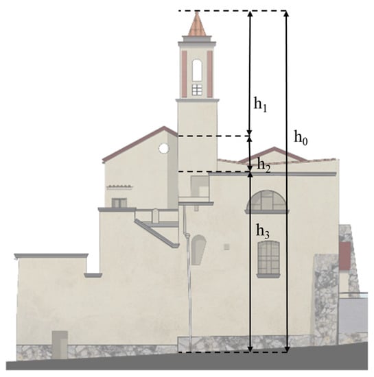 The bell tower has an overall height of 17.20 m (h0). Its base is placed on a pillar at an altitude of 7.40 m (h3) and is adjacent to the external wall of the sacristy for 2.30 m (h2) (Figure 5).