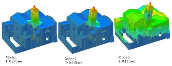 The analysis highlighted that the first and second mode shapes concerned the bell tower, which represents the most vulnerable element of the building. The first two modes activated the 6.0% (y direction) and 9.5% (x direction) of the global mass (Figure 7), respectively. This condition, therefore, requires an in-depth study of the tower, such as kinematic or rocking analysis.