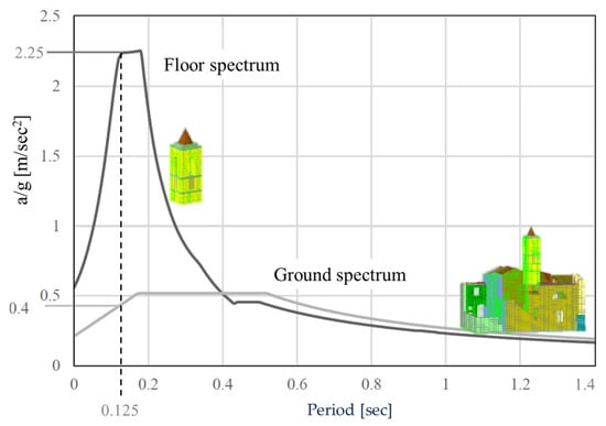 The tower floor spectrum (Figure 8) has a maximum acceleration (a = 2.25 g), for periods between 0.1 and 0.2 s, with amplification of about four times with respect to the ground level. Therefore, the maximum amplification happens between 5 Hz and 7.98 Hz, where the last one is the fundamental vibration frequency of the bell tower.