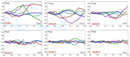 Rotation time histories ϑ(t) diagrams. Groups of conditions I–VI (Table 2).