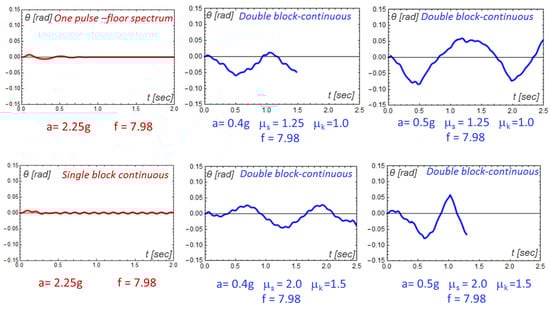 The rotation time histories for the conditions indicated in Table 4 are reported in Figure 12. As can be see, the maximum values of the tower rotations were obtained using the double-block model, even though they were, in all the examined cases, lower than the overturning angle, defined by arctan b/h = 0.35, corresponding to geometric instability. In general, the rotations obtained using the floor spectrum at the tower base were 10−1 smaller with respect to those due to the double-block model. The larger rotation angles shown in the double-block model, both in the one sine pulse and in the continuous base excitation case, confirm the reliability of the presented model for a safe preliminary analysis.