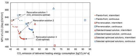 | Pre-Renovation | Standard-Based Solution | Renovation Solution 1 (CO2 Emissions-Optimal) | Renovation Solution 2 | Renovation Solution 3 (Cost-Optimal) | |